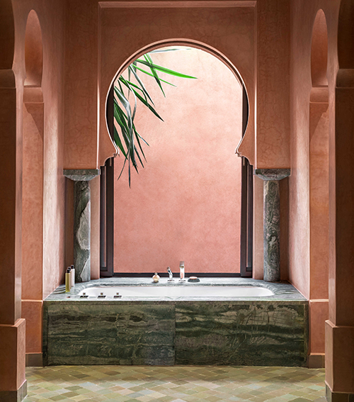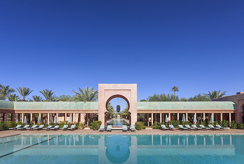 Amanjena, das „friedliche Paradies“, wurde erst vor kurzem nach einer umfassenden Renovierung wiedereröffnet und die Pavillons und Maisons (wohlgemerkt: keine Zimmer) erstrahlen in neuem Glanz. Jeder Pavillon (175 m²) hat nicht nur einen Innenhof mit Springbrunnen und Sitz ecke, sondern ist auch von einer spektakulären domartigen Kuppeldecke gekrönt. Die Innenausstattung des Schlaf- und Wohnbereichs mit offenem Kamin ist elegant, bietet alle modernen technologischen Errungenschaften und gipfelt in einem geräumigen Badezimmer aus grünem marokkanischen Marmor. Mit ihren rötlichen Säulen, erdigen Tönen und türkisfarbenen Elementen im Pool und Wasser becken, spiegelt das Amanjena die Farben der Olivenhaine, Berberdörfer und des Atlasgebirges in der Umgebung wider. Die luxuriöse Anlage samt beeindruckender Eingangs-Kolonnade mit Boutique, Spa, Bibliothek, Tennisplätzen und mehreren Restaurants, könnte zweifellos auch ein Palast des Königs sein, der übrigens nur 10 Autominuten entfernt bei der Medina und dem berühmten Platz der Gaukler, Akrobaten und Schlangenbeschwörer, Djemaa El Fna, liegt. Noch näher am Resort liegen die großartigen Golfkurse Amelkis, Al Maaden und das Atlas Golf Resort.