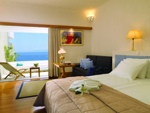 Alle Zimmer und Suiten haben Meerblick, sind durchwegs ausgestattet mit Klimaanlage/Heizung, Minibar, TV, Safe und Föhn. Die en-suite Marmorbäder sind mit Musik über den Fernseher versehen und verfügen über Telefonverbindung ins Zimmer. Im Restaurant „Nafsika“ wird bei herrlicher Aussicht über die Bucht das Frühstück und das Table d’hôtel Abendessen serviert. In den Sommermonaten bietet das „Elies“ Restaurant im Olivenhain mediterranes und kretisches à la carte Abendessen, während in der Hochsaison in der „Odysseus“ Taverne direkt am Meer frische Meeresfrüchte und griechische Gerichte zum Mittagessen serviert werden.