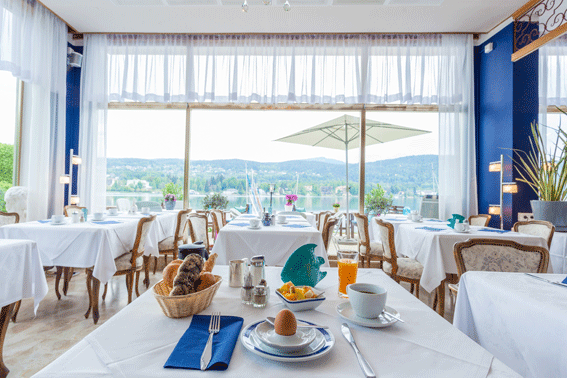 Morgens genießt man das Frühstück auf der sonnenbeschienenen Frühstücksterrasse mit atemberaubendem Blick auf das klare Wasser des Wörthersees, begleitet von Vogelgezwitscher und dem leisen  Rauschen  des  Windes  über  die  Wellen.  Das Frühstücksbuffet sucht seinesgleichen und wird mit viel Sorgfalt zubereitet. Besonders Wert gelegt wird  auf  regionale,  saisonale  Produkte  aus  dem  Alpen-Adria-Raum. Der Blick von der Panoramaterrasse ist einzigartig und reicht vom Schloss Velden bis nach Pörtschach und entlang der umgebenden Berge wie Gerlitzen und Karawanken. Die Sonne begleitet den Gast vom Frühstück bis zum Sonnenuntergang, und die etwas höher liegende Terrasse bietet einen idealen Aussichtspunkt für ein abendlichen Drink mit Blick auf die untergehende Sonne im tiefen Wasser des Wörther Sees. Auch Parkplätze stehen ausreichend zur Verfügung.