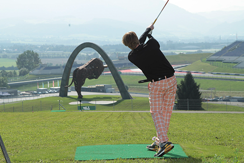 Mitten am Red Bull Ring befindet sich das erste Golfloch auf einer Rennstrecke. Es ist ein Par 3 mit einem erhöhten Abschlag. Der Anblick hier lässt Respekt aufkommen, führt doch der Weg des Balles über das Kiesbett und die Rennstrecke, direkt unter dem großen Bullen aus Stahl, dem Wahrzeichen der Rennstrecke. Diese Spielbahn wird an einigen Tagen pro Jahr und speziell für Gruppenevents geöffnet.
