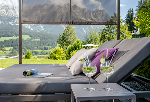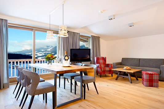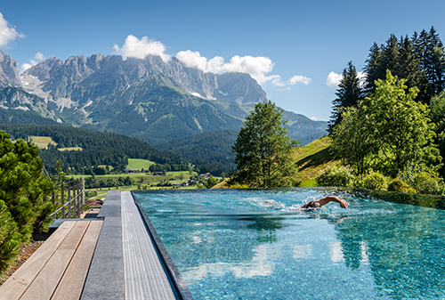 In dem Genuss- und Lifestyle-Hotel in Ellmau genießen Urlauber die individuell perfekte Auszeit vom Alltag und erleben das besondere Flair der Tiroler Alpen. Ursula und Andreas Windisch verwirklichten Ihre Vision und gaben dem Haus eine neue Atmosphäre. Ein Highlight ist ganz sicher der 20 Meter lange, ganzjährig beheizte Infinity Pool mit Bergblick. Das Badehaus mit Hallenbad, Panorama-Ruheraum mit Kamin und Saunalandschaft lädt zum Entspannen vor einer Traumkulisse ein. In den neuen, individuell gestalteten Zimmern und Suiten mit Kaiserblick trifft Komfort auf Understatement. Eleganz auf lässige Sportlichkeit. Dabei sorgen die hellen Eichenholzböden für ein entspanntes Gefühl der Leichtigkeit. Edle Stoffe geben dem Raum eine elegante Note. Tiroler Loden schenkt dem Raum ein charmantes alpines Flair.