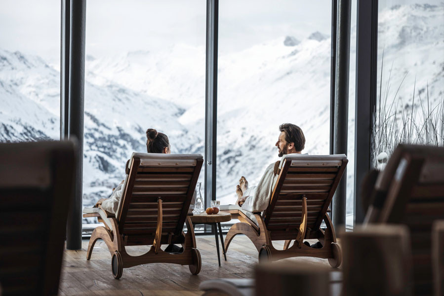 Nach einem Tag voller Sport – egal, ob Sie golfen oder Ski fahren – lädt der 2.000 m² große Wellnessbereich zum Abschalten ein. Genießen Sie eine wohltuende Massage, ent spannen Sie in den Saunen oder lassen Sie sich in einem der beiden Außenwhirlpools treiben und genießen Sie dabei den atemberaubenden Blick auf die verschneite Bergwelt.