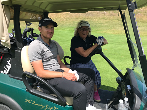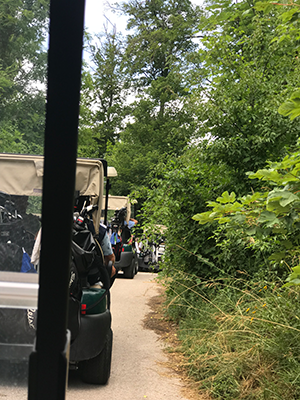 Schon bei der Auffahrt im Konvoi zu den Abschlägen spürte ich den Team-Spirit. Mathieu erzählte uns, dass er seit Sommerbeginn mit der Corona-Lockerung nun schon sechs Turniere gespielt habe. Müdigkeit war bei seinen ersten Drives um die 200 m bei ihm jedoch nicht zu erkennen. Für ihn bedeutete dieses ProAm zwar ein Trainingsspiel, aber man merkte ihm auch die Freude an, das Spiel gemeinsam mit neuen Golffreunden zu genießen. Und mein Spiel wurde nach einigen anfänglichen „Hoppalas“ dann doch noch ganz ordentlich, was unserem französischen Pro und seinem Caddie so manches Lob entlockte: „good shot“, „très bien“!