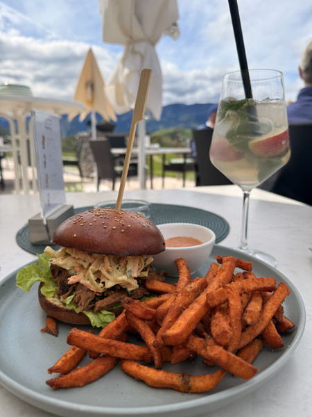Klar, bieten sie auf ihrer überschaubaren Menükarte auch die Klassiker wie Club Sandwich oder Toast Hawaii an. Aber: „Wir kochen aus Leidenschaft, feiern Produkte aus der Region und servieren Gerichte, die einfach nur gut schmecken“, berichtet Marco. Natürlich berücksichtigen sie dabei die saisonalen Highlights wie Schwammerl, Wild oder Spargel. Besonders beliebt seien das täglich wechselnde Zwei-Gänge-Tagesgericht für 13 Euro und die Grillabende am Freitag. „Uns ist es wichtig, mit unserem Kochen und unserer Gastfreundschaft die Gemeinschaft und ein lebendiges Clubleben zu unterstützen“, fügen beide unisono hinzu. So initiierten Sabrina und Marco auch erstmalig in diesem Jahr das Charity-Turnier Pro Sales-Cup, an dem rund 100 Golferinnen und Golfer teilnahmen und das 10.000 Euro zugunsten von Pink Ribbon einspielte.