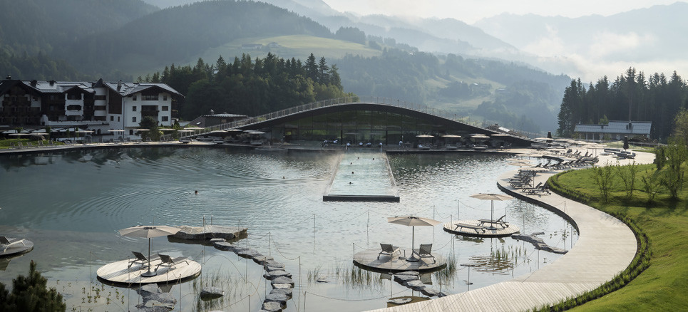Was auch immer die Gastgeberfamilie Altenberger plant – es muss im Einklang mit der Natur geschehen und besonders umwelt- und ressourcenschonend umgesetzt werden. Dies gilt auch für das Spa ATMOSPHERE by Krallerhof – Adults Only. Gestaltet vom renommierten Star-Architekten Hadi Teherani, präsentiert sich das ATMOSPHERE als ein puristisches Bauwerk aus Glas, Holz und Sichtbeton, das sich respektvoll in die Salzburger Landschaft integriert.
