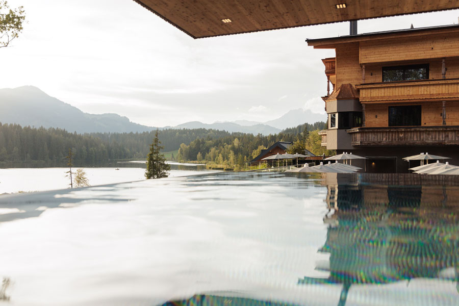 Die Wellness-Oase des Hotels auf über 1.300 m² mit ganzjährig beheiztem Infinity Pool, Ruheräumen, Sonnendeck und der unvergleichlichen See-Sauna ist eine wahre Augenweide. Als Ganzjahresdestination bietet das Alpenhotel Kitzbühel Sommer wie Winter durch die einmalige Lage eine Vielzahl an Sport- und Lifestyle-Aktivitäten. Im hoteleigenen Restaurant mit großer Son nenterrasse etwas oberhalb des Schwarzsees genießt man verführerische Köstlichkeiten in traumhaftem Ambiente.