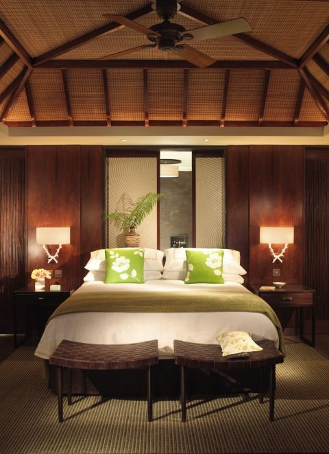 zwei bis sechs Schlafzimmern und eine Presidential Suite. Alle Villen und Residenzen sind ebenerdig und wurden in die natürliche Landschaft eingepasst. Das mauritische Architekturbüro Macbeth verwendete lokale, ursprüngliche Materialien wie vulkanisches Gestein, Holz und Marmor. Verschieden Grün-, Terrakotta, Crème- und Brauntöne spiegeln die natürliche Umgebung wider und schaffen eine friedliche Atmosphäre. Großzügige Fenster und Türen verleihen ein Gefühl der Freiheit. Eine große Veranda mit Essmöglichkeit, ein kleiner Pool und ein privater Garten mit Palmen, Farnen, Hibiskus und Wachsblumen runden das intime Ambiente ab. Die
